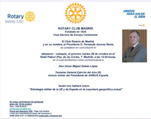 El pasado martes 28 de octubre tuvimos nuestra reunión periódica en el Hotel Palace, donde contamos con un conferenciante de excepción: Don César Miguel Simón López, Teniente General Ejército del Aire (R), Asesor militar del Presidente de AIRBUS España