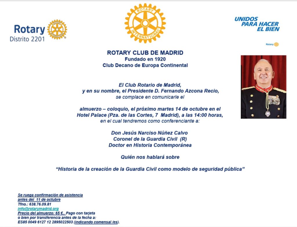 Se comunica la reunión – almuerzo el próximo martes 14 de octubre, en el Hotel Palace (Plaza de las Cortes, 7, Madrid), a las 14:00 horas, en la cual tendremos como conferenciante a Don Jesús Narciso Núñez Calvo, Coronel de la Guardia Civil (R) y Doctor en Historia Contemporánea.